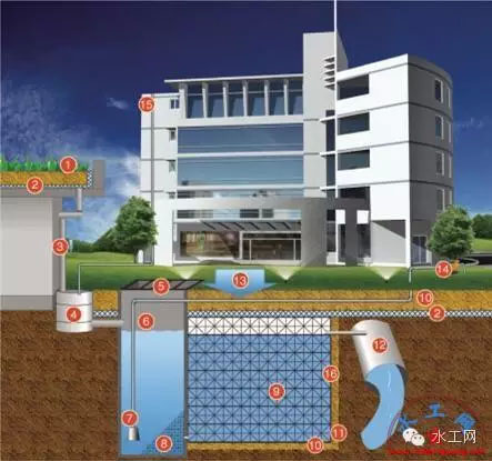 1、屋頂花園2、排水網絡3、重力雨水管4、過濾井5、井蓋6、排放控制井7、回用管路8、過濾網9、雨水模塊10、干凈的粗河砂11、防水層12、市政管道13、地表滲水14、地面水泵15、虹吸雨水管16、土工織物